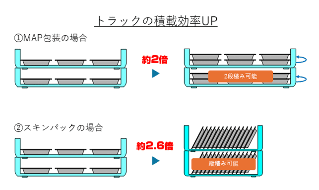 By converting to packaging methods such as MAP packaging and skin pack packaging that can extend expiration dates and improve loading efficiency, logistics efficiency can be improved and optimized.