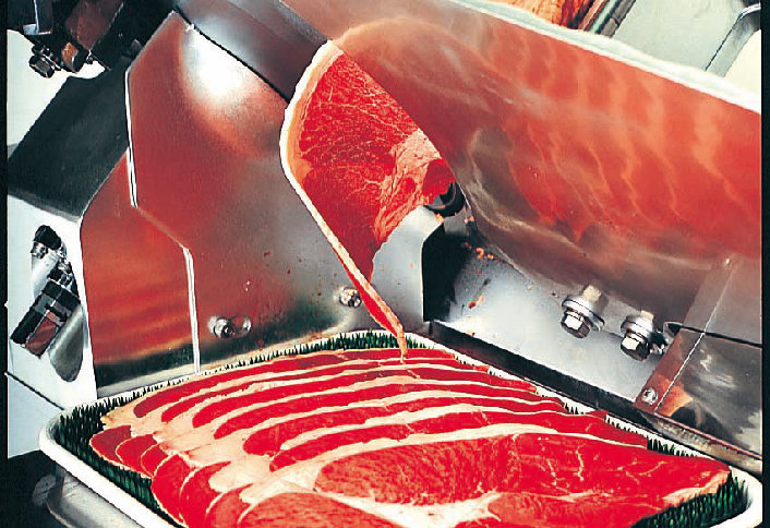 バラ肉など厚みのない冷凍肉・焼肉材料(-8℃~-2℃)を斜めの斜め切りし、幅広く長くスライス